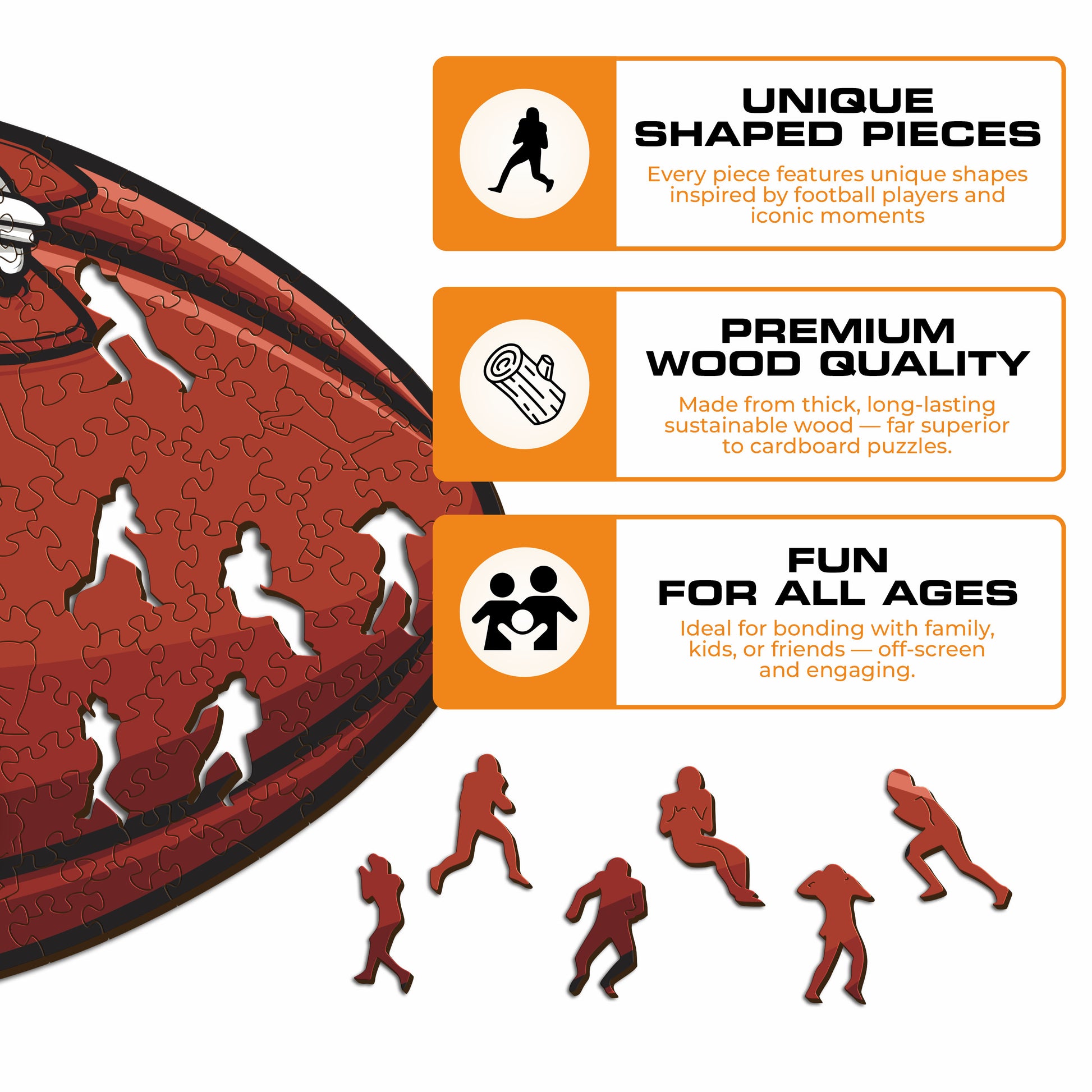 ✓ Each puzzle piece has a unique shape that depicts elements related to football and iconic players poses.