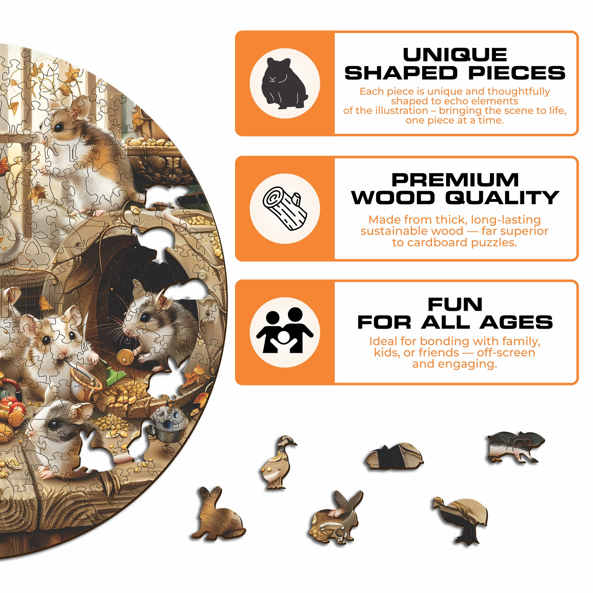 ✓ Each puzzle piece has a unique shape that depicts elements related to hamsters.