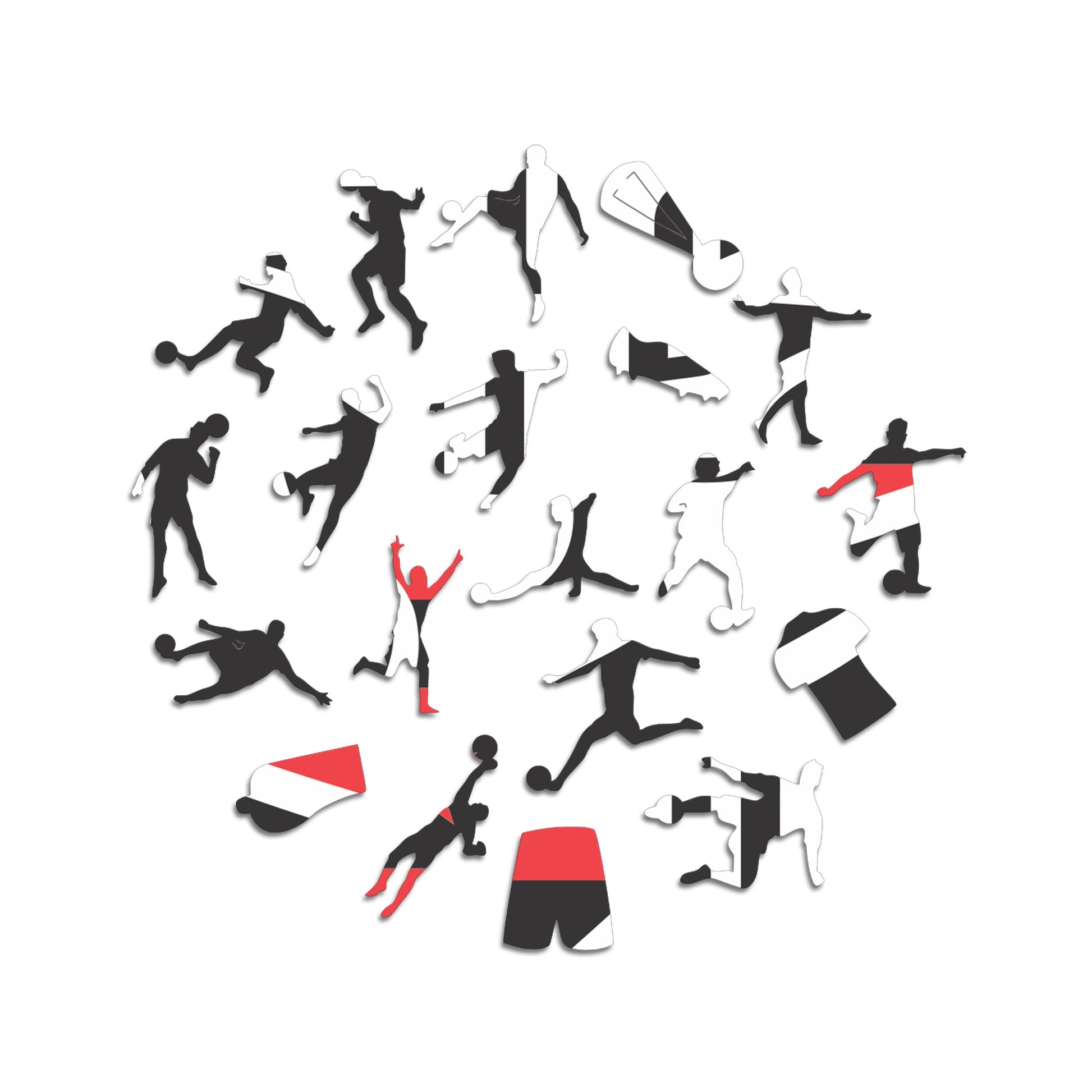Each puzzle piece has a unique shape that depicts elements related to soccer and iconic players poses.
