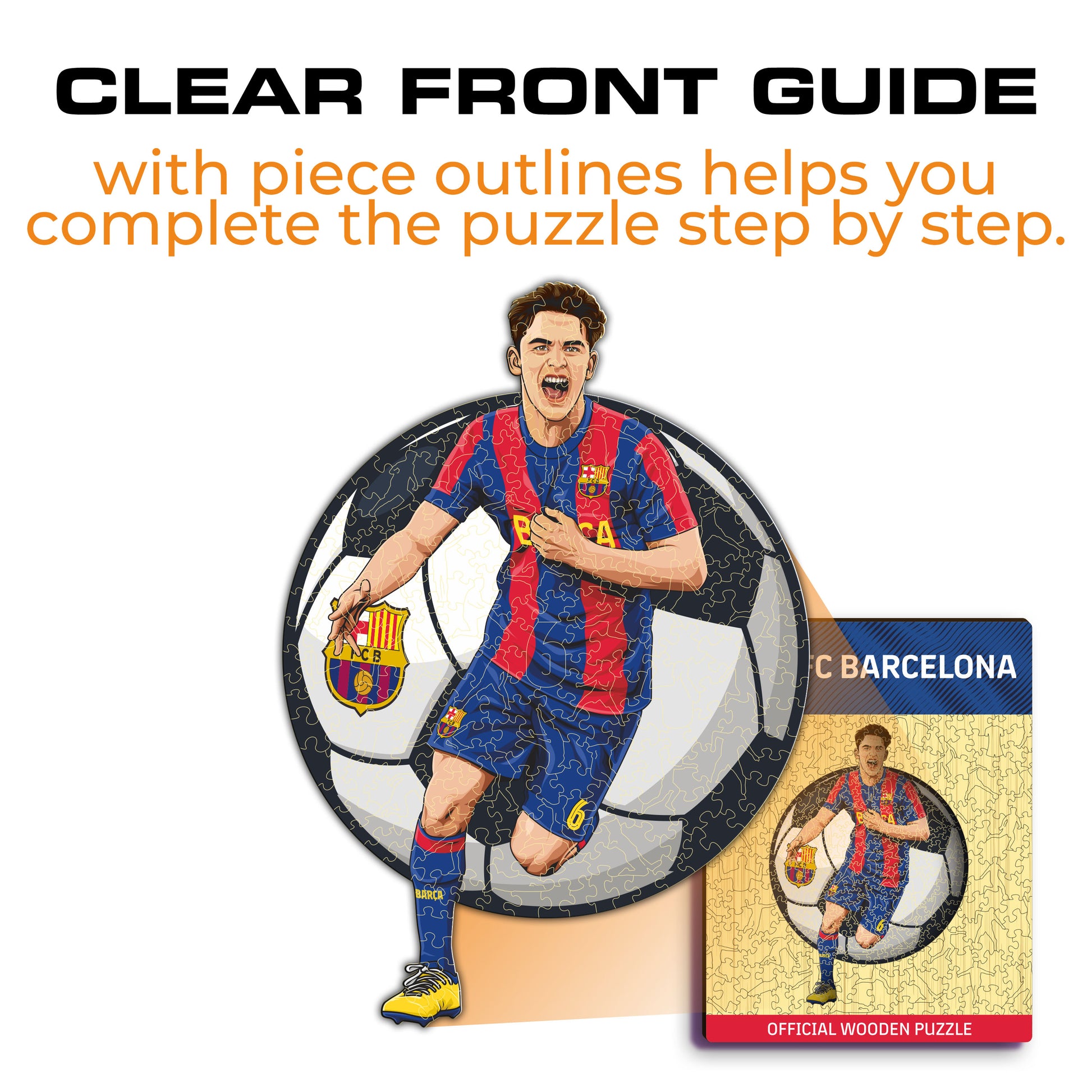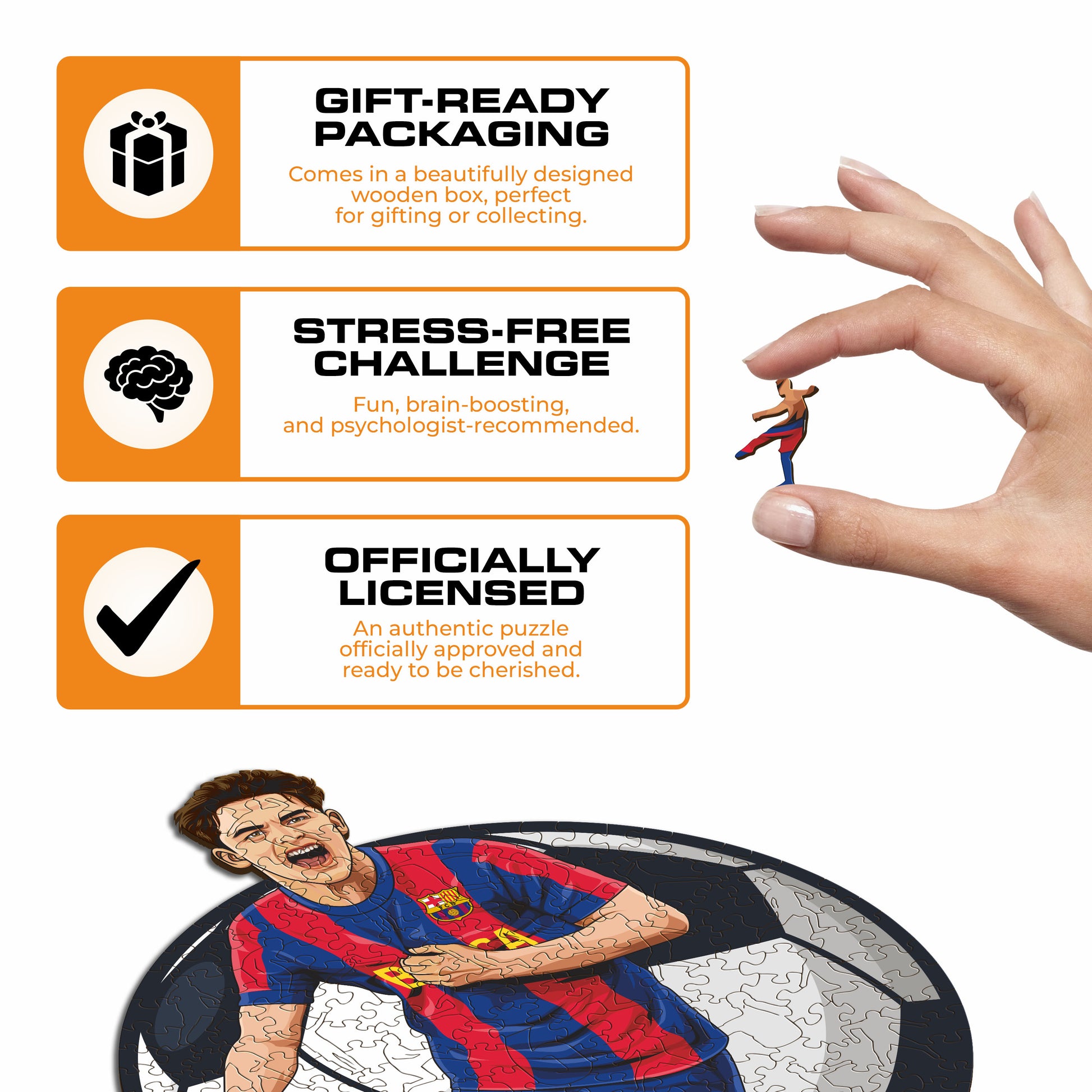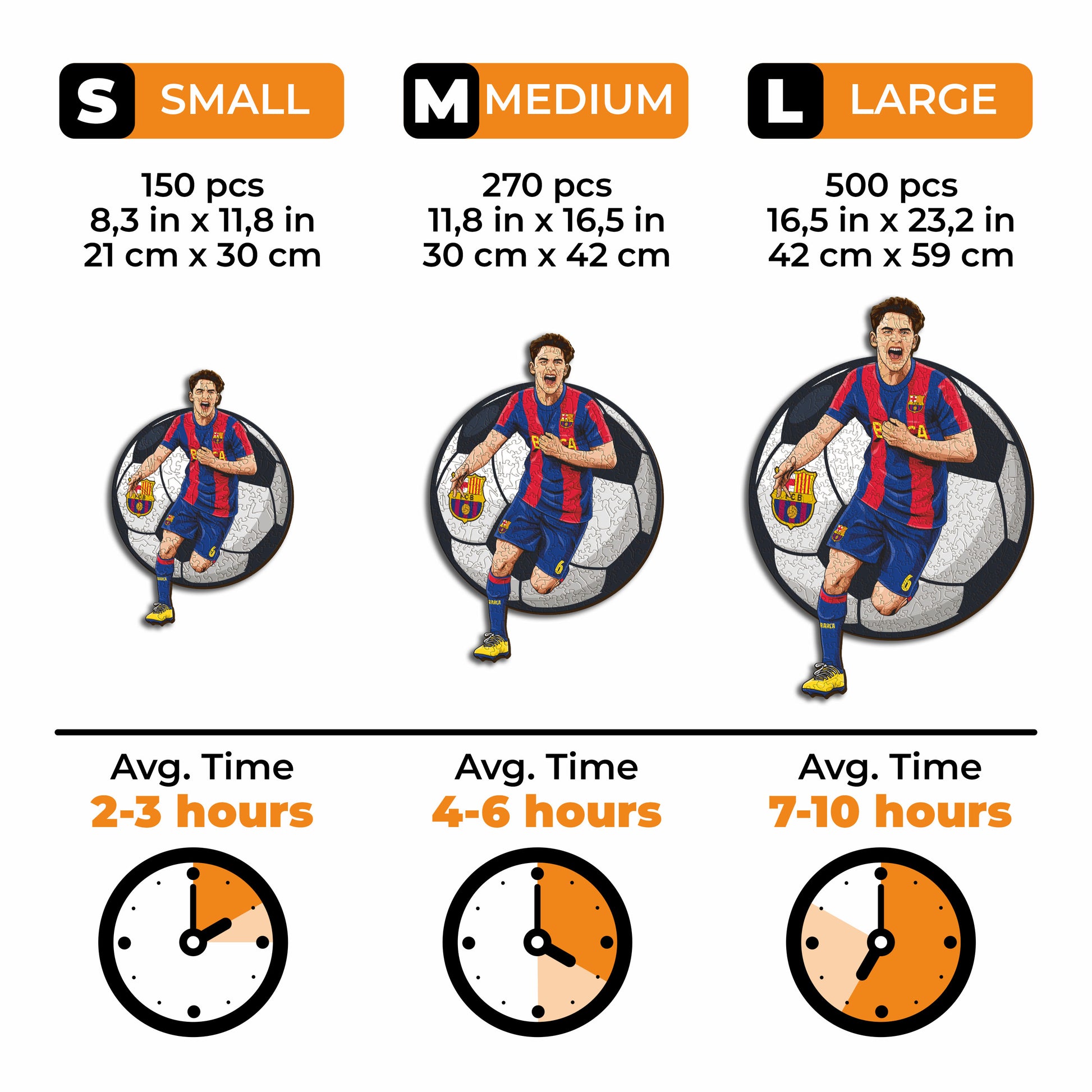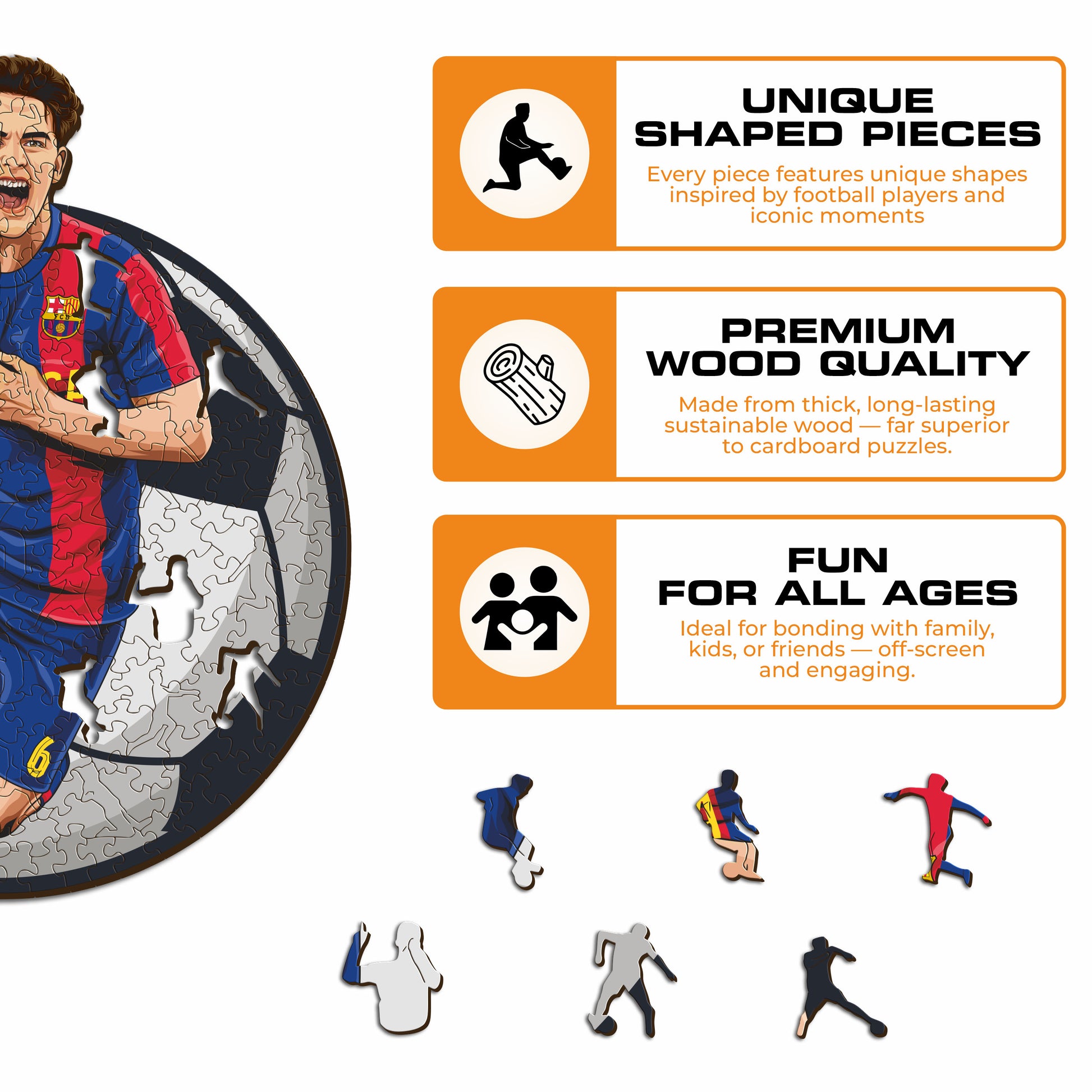 ✓ Each puzzle piece has a unique shape that depicts elements related to soccer and iconic players poses.