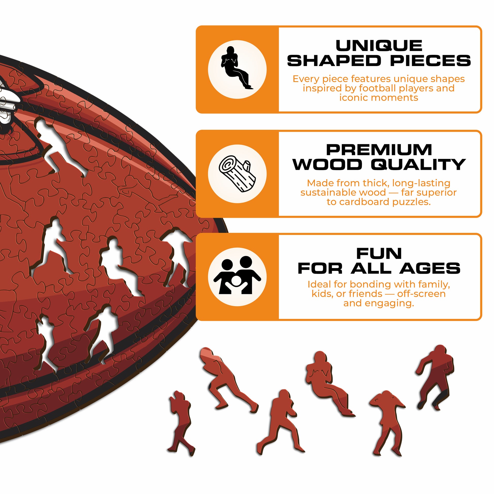 ✓ Each puzzle piece has a unique shape that depicts elements related to football and iconic players poses.