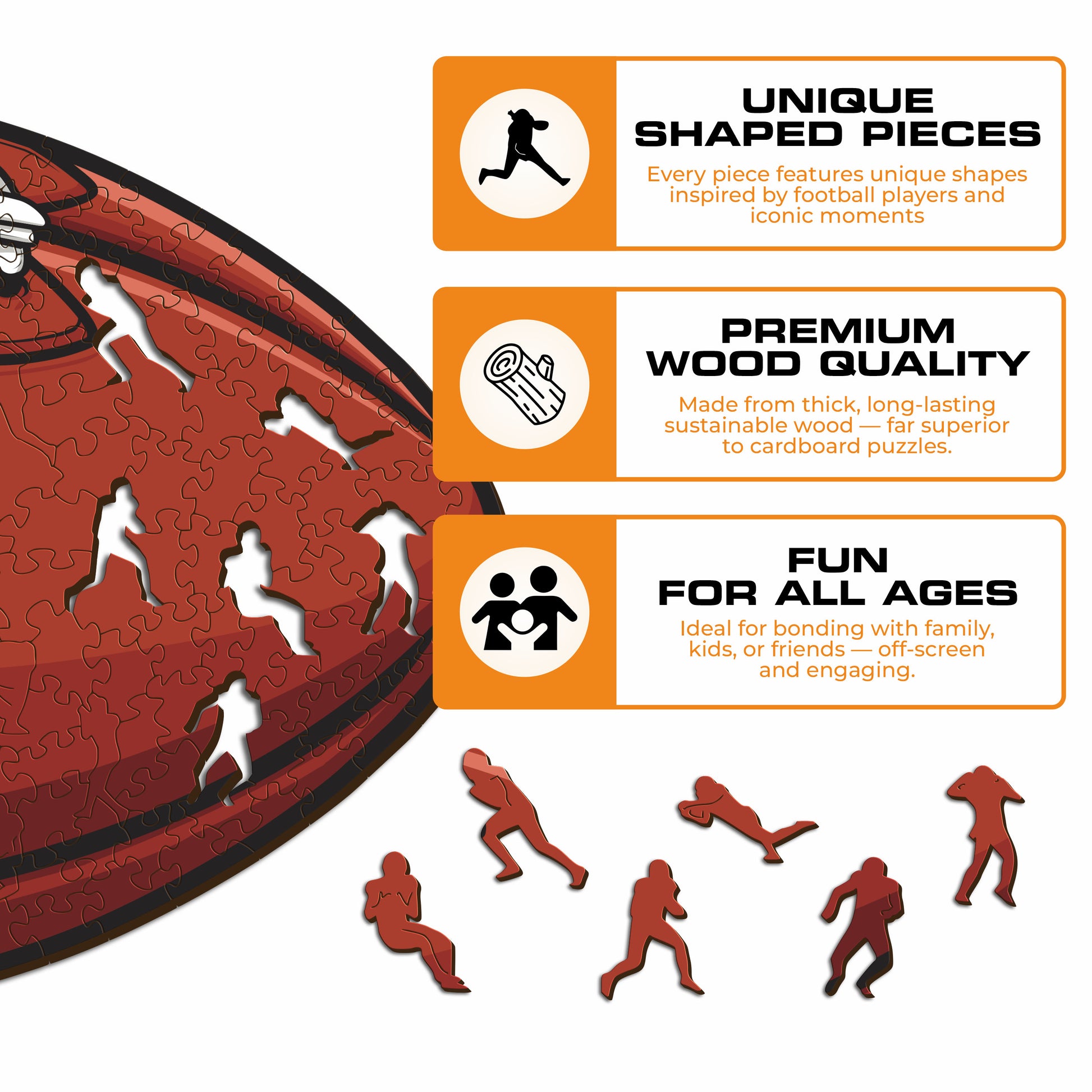 ✓ Each puzzle piece has a unique shape that depicts elements related to football and iconic players poses.