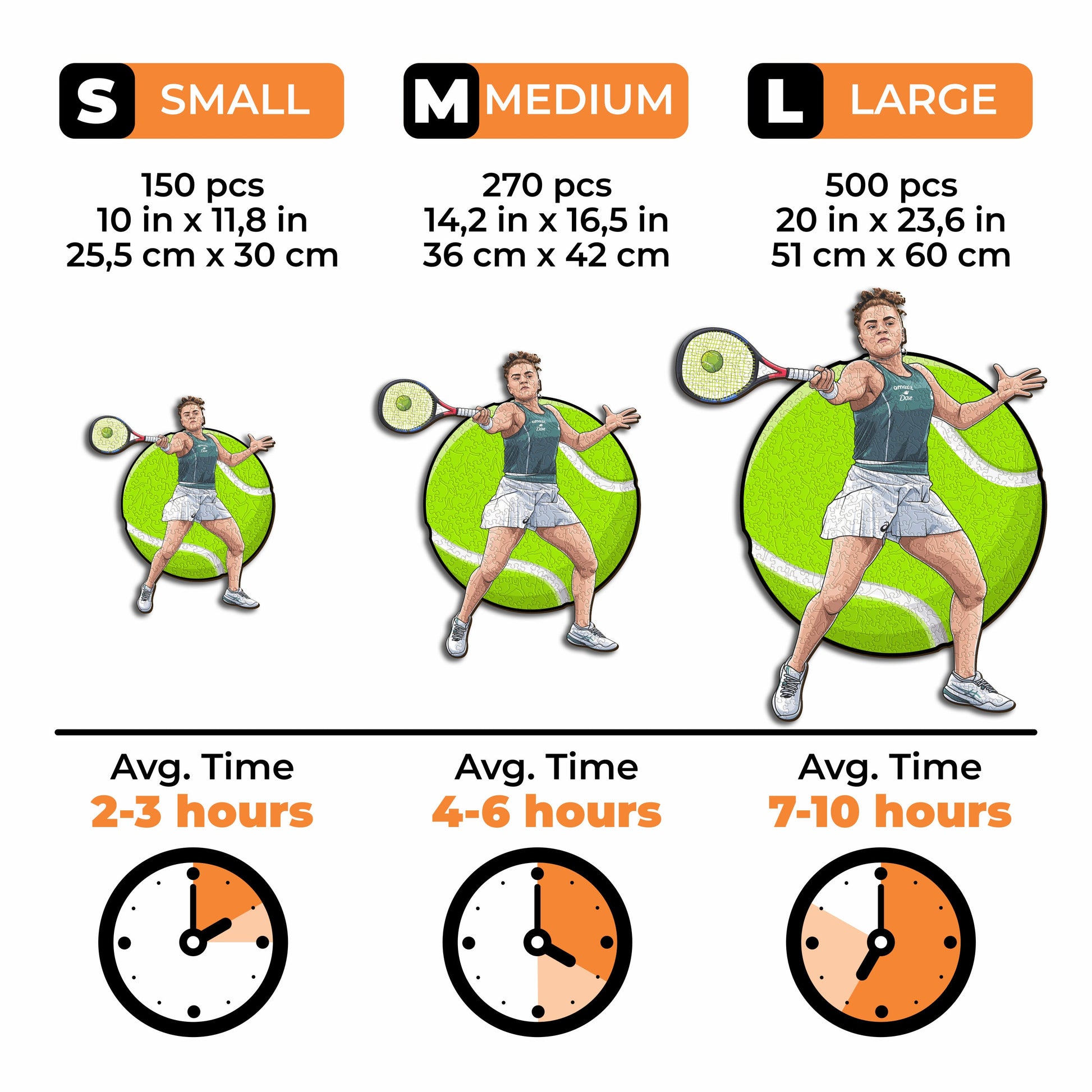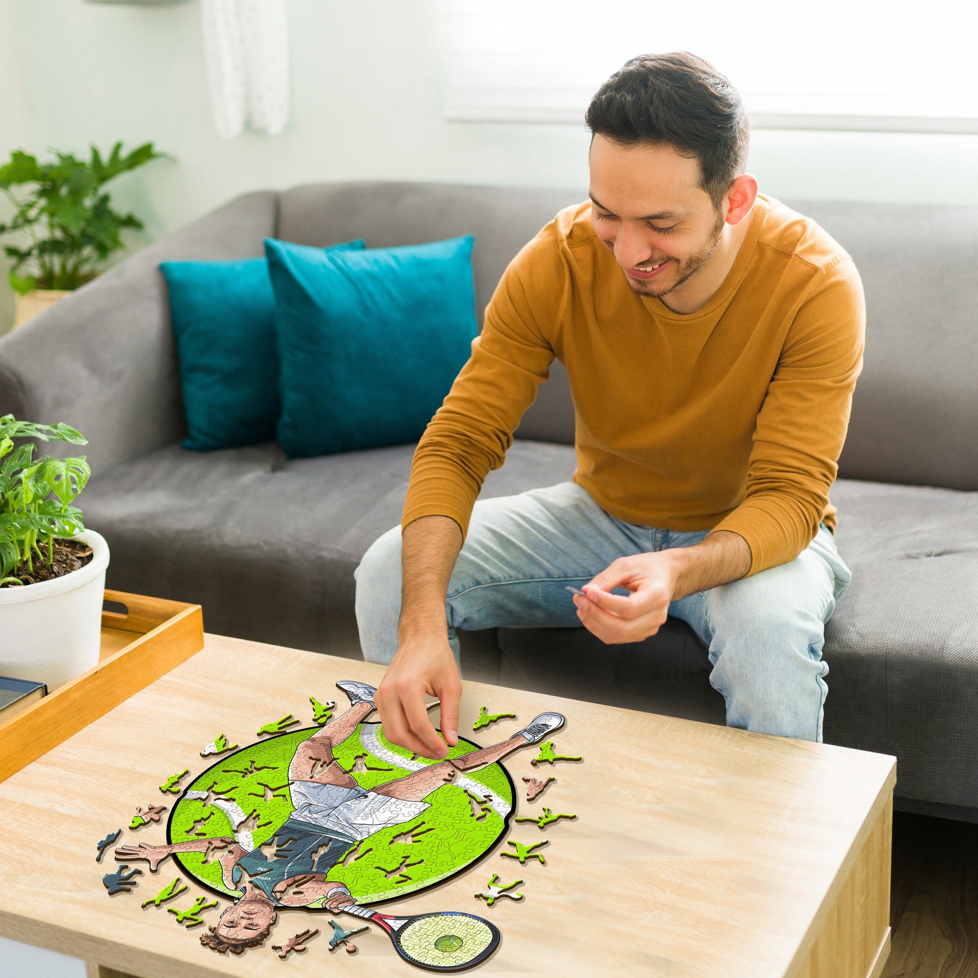 ✓ Each puzzle piece has a unique shape that depicts elements related to tennis and iconic player poses.