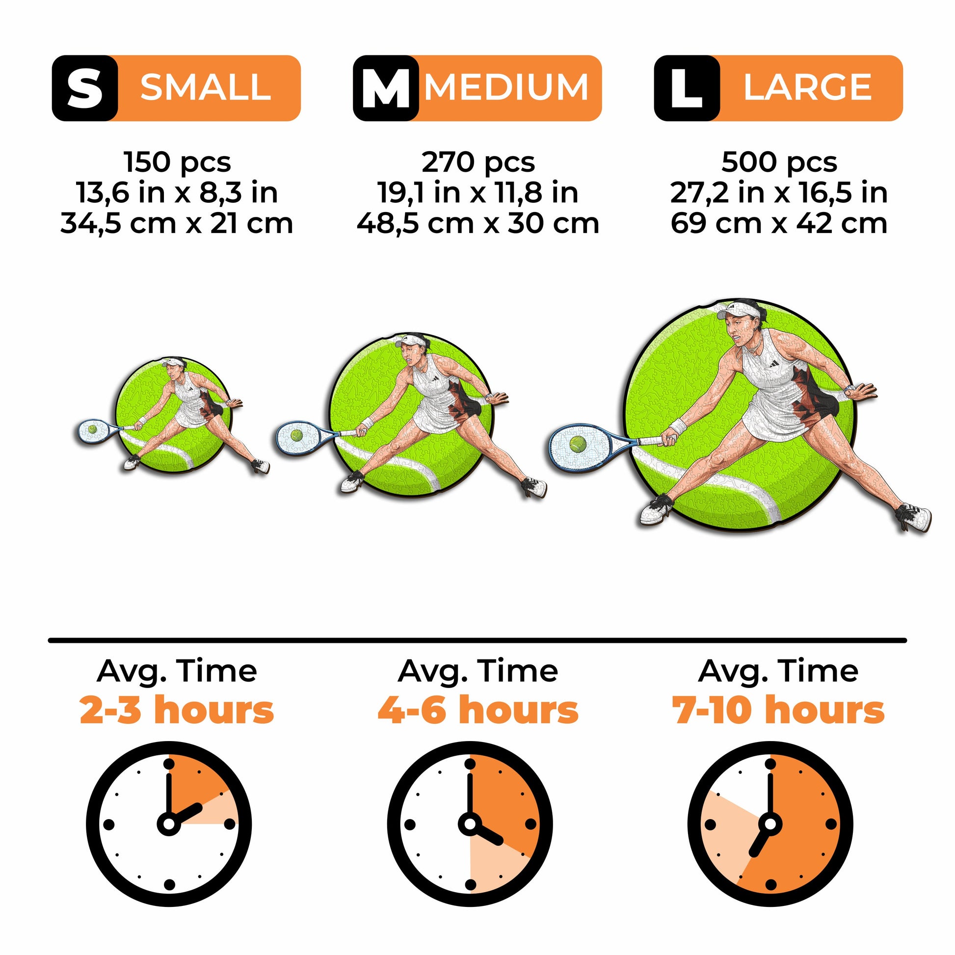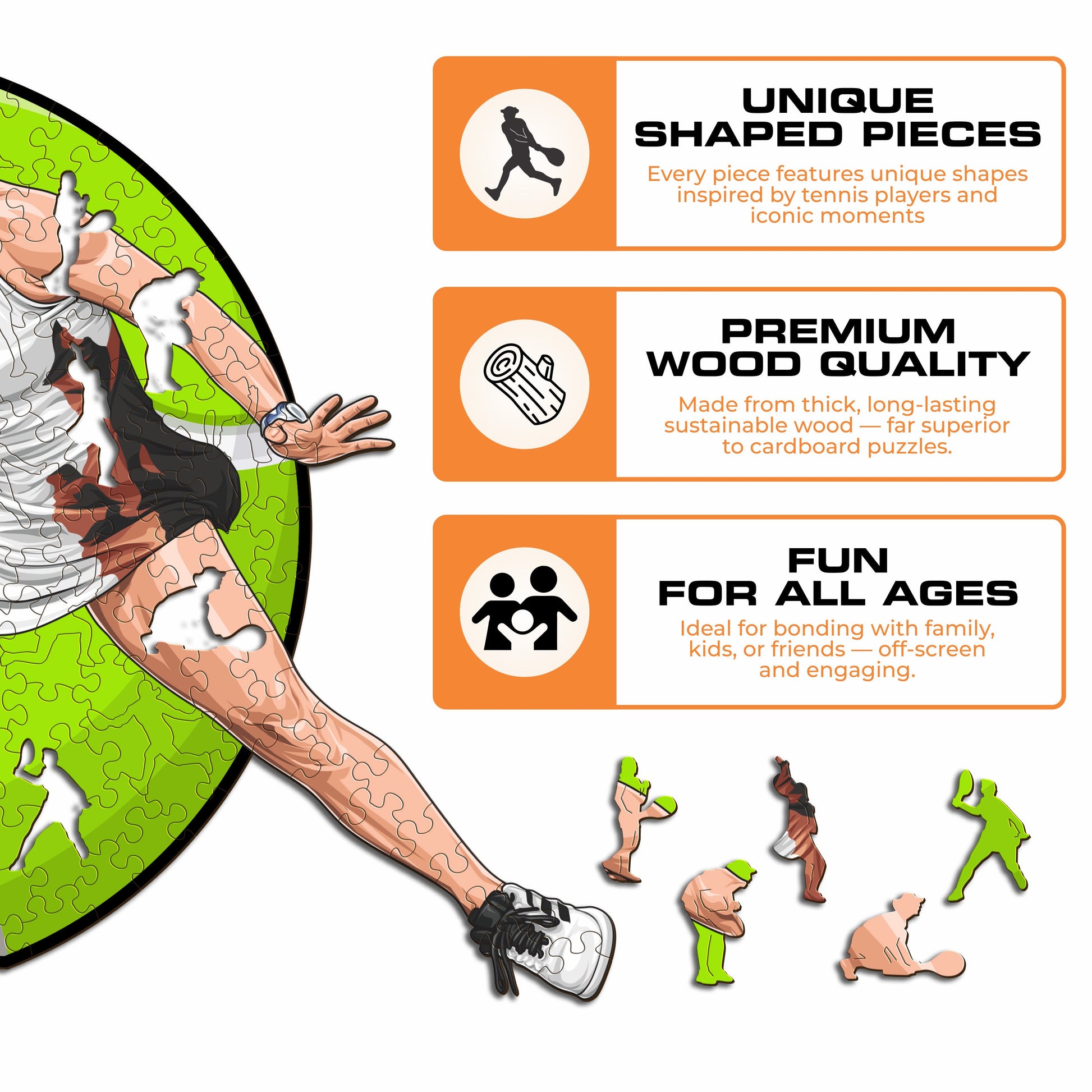 ✓ Each puzzle piece has a unique shape that depicts elements related to tennis and iconic player poses.