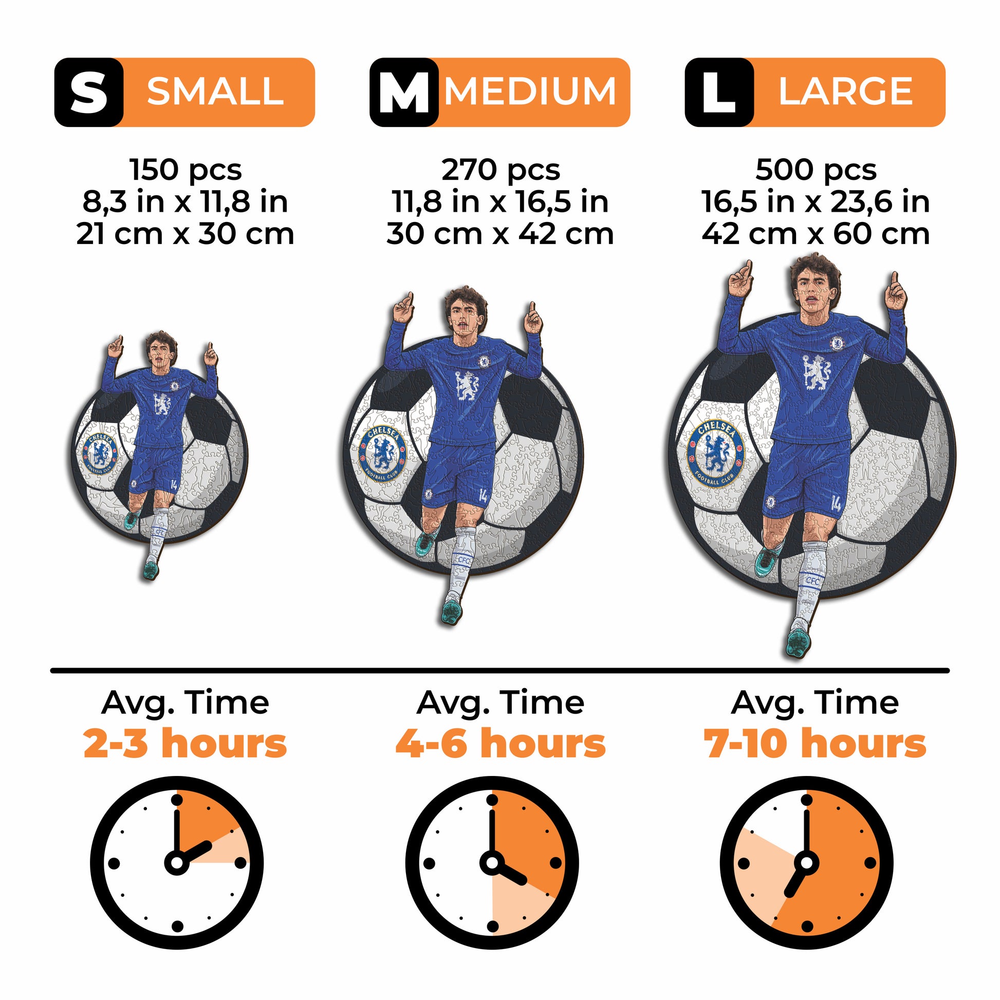 ✓ Each puzzle piece has a unique shape that depicts elements related to soccer and iconic players poses.