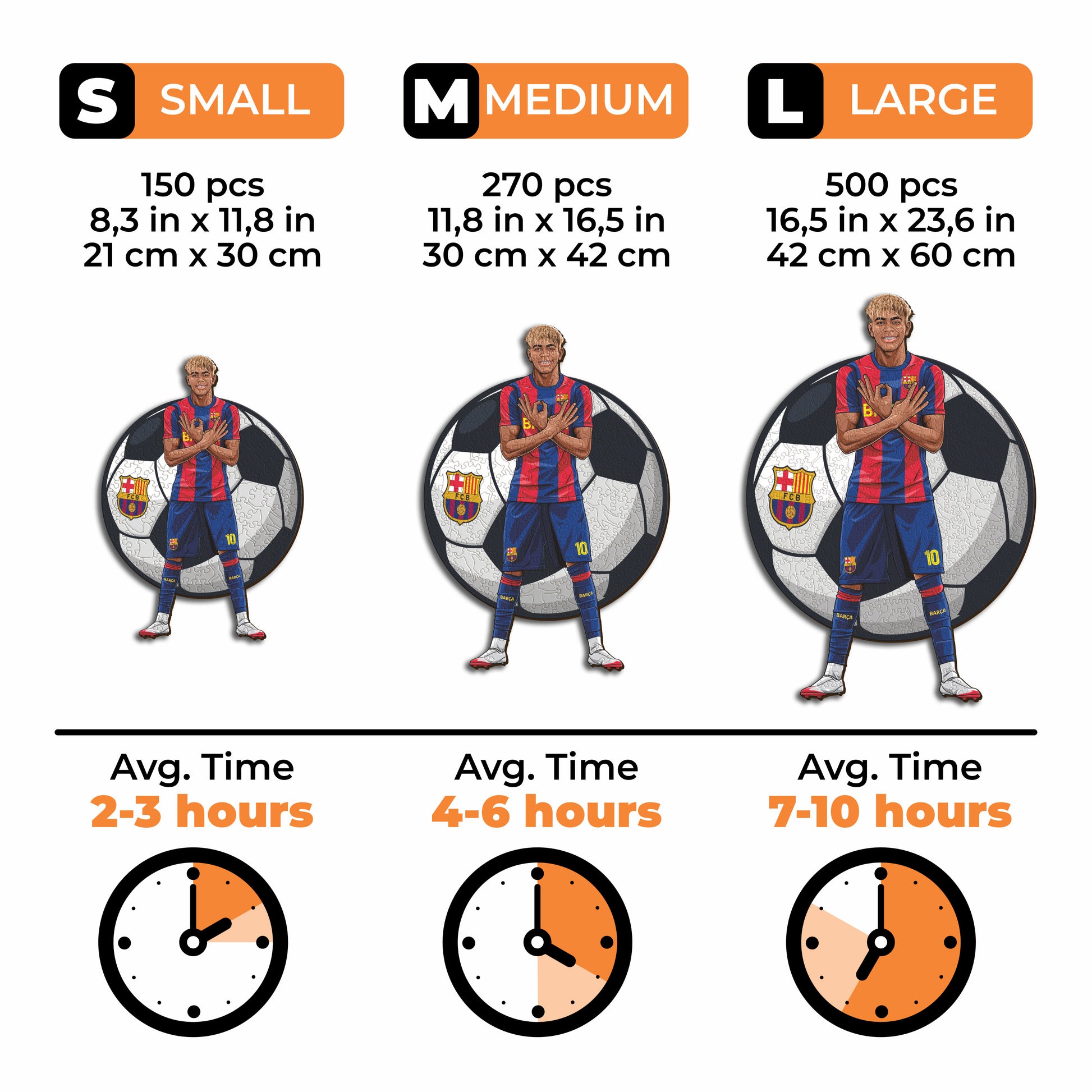 ✓ Each puzzle piece has a unique shape that depicts elements related to soccer and iconic players poses.