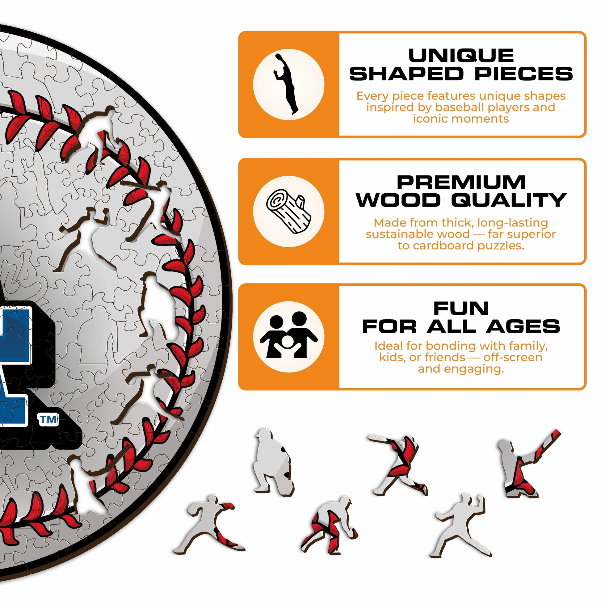 ✓ Each puzzle piece has a unique shape that depicts elements related to baseball and iconic player poses.
