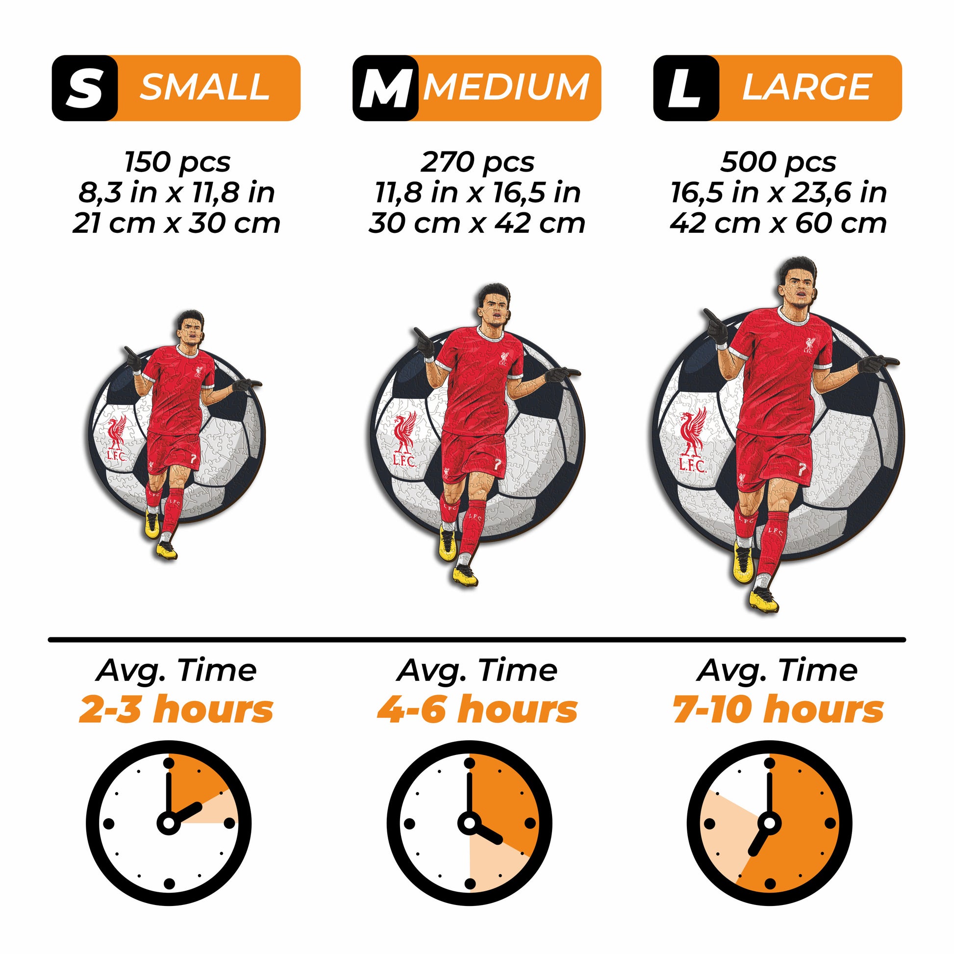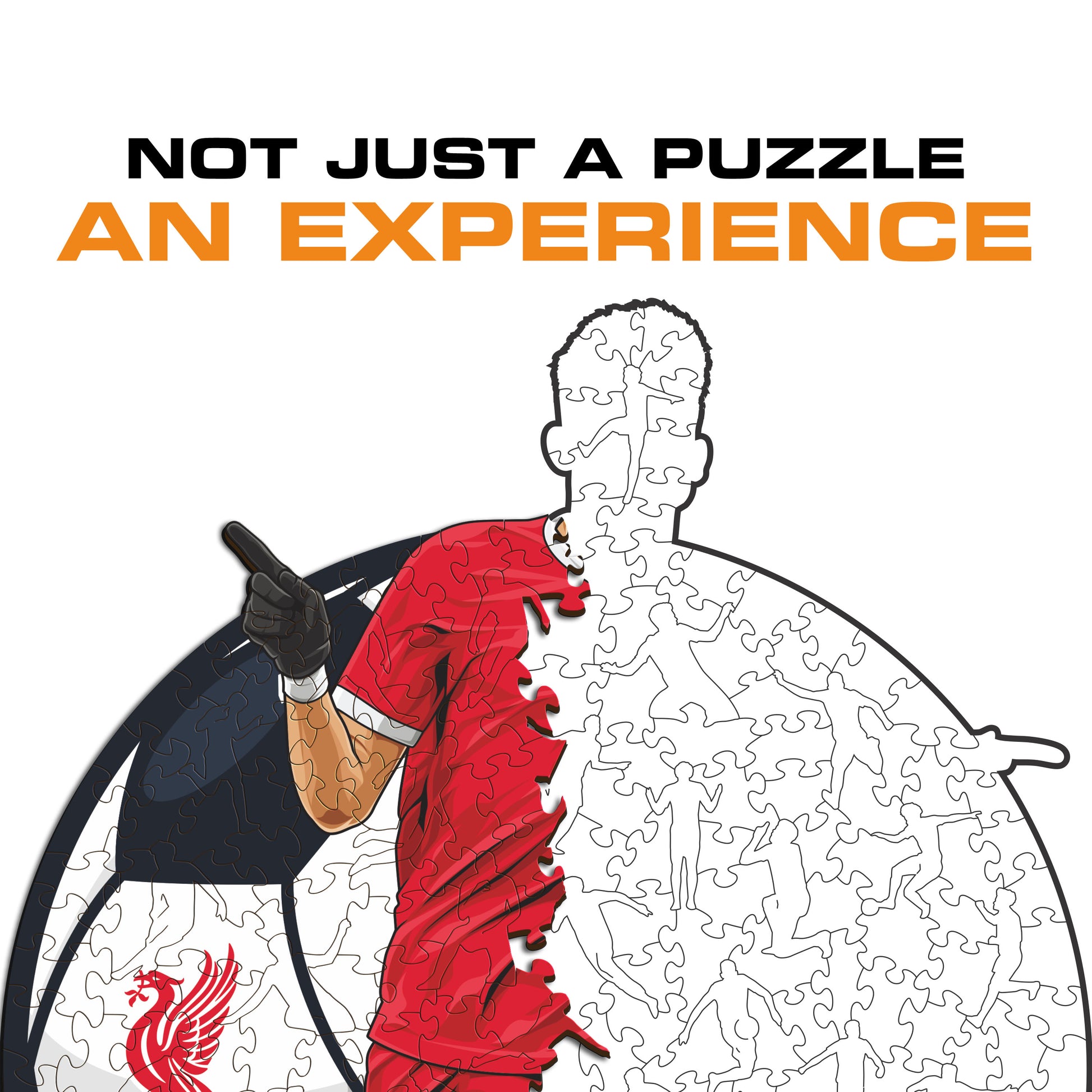 Each puzzle piece has a unique shape that depicts elements related to soccer and iconic players poses.