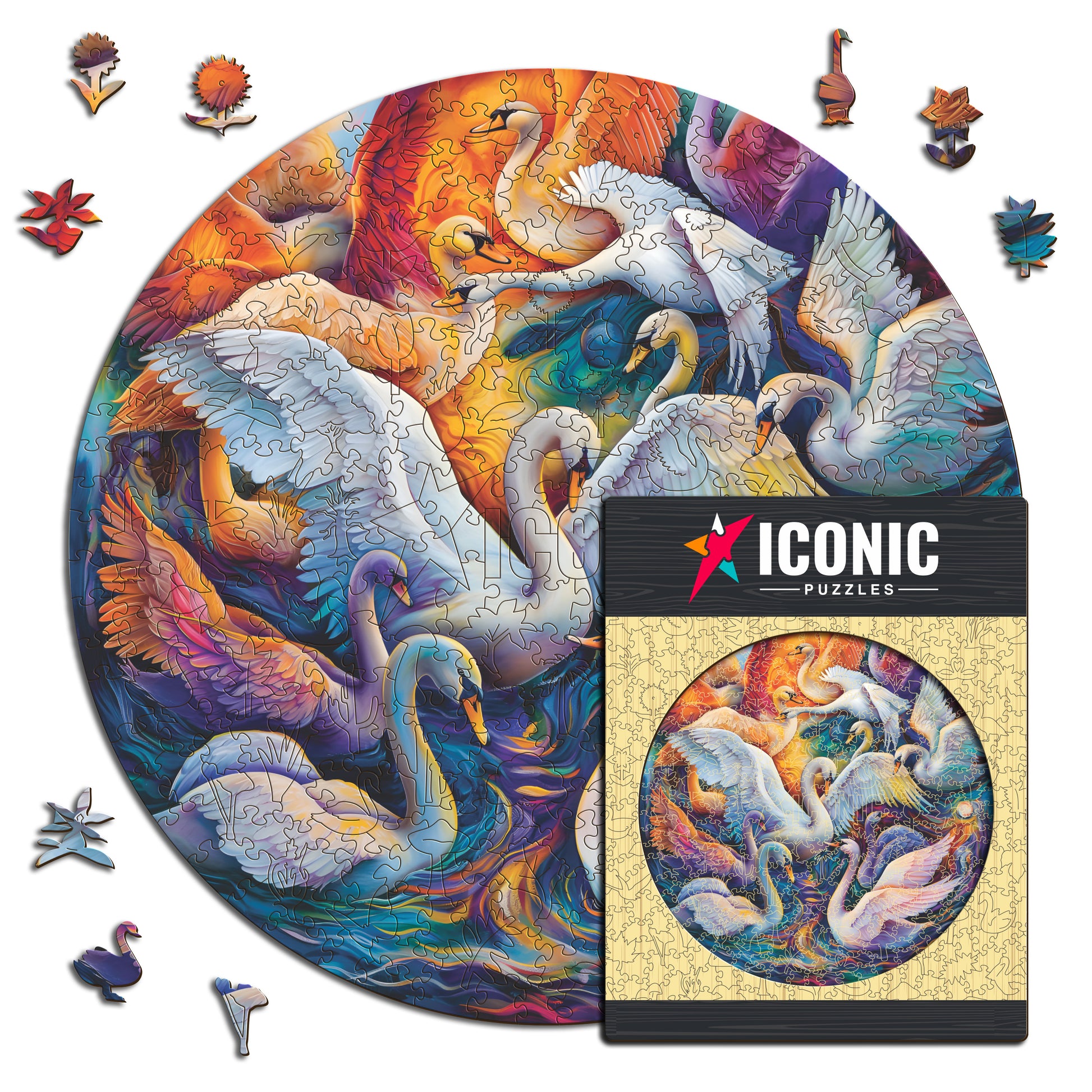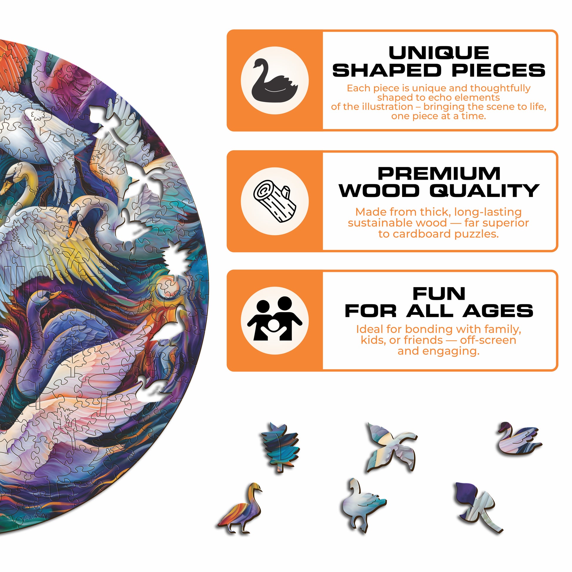 ✓ Each puzzle piece has a unique shape that depicts elements related to swans and nature.