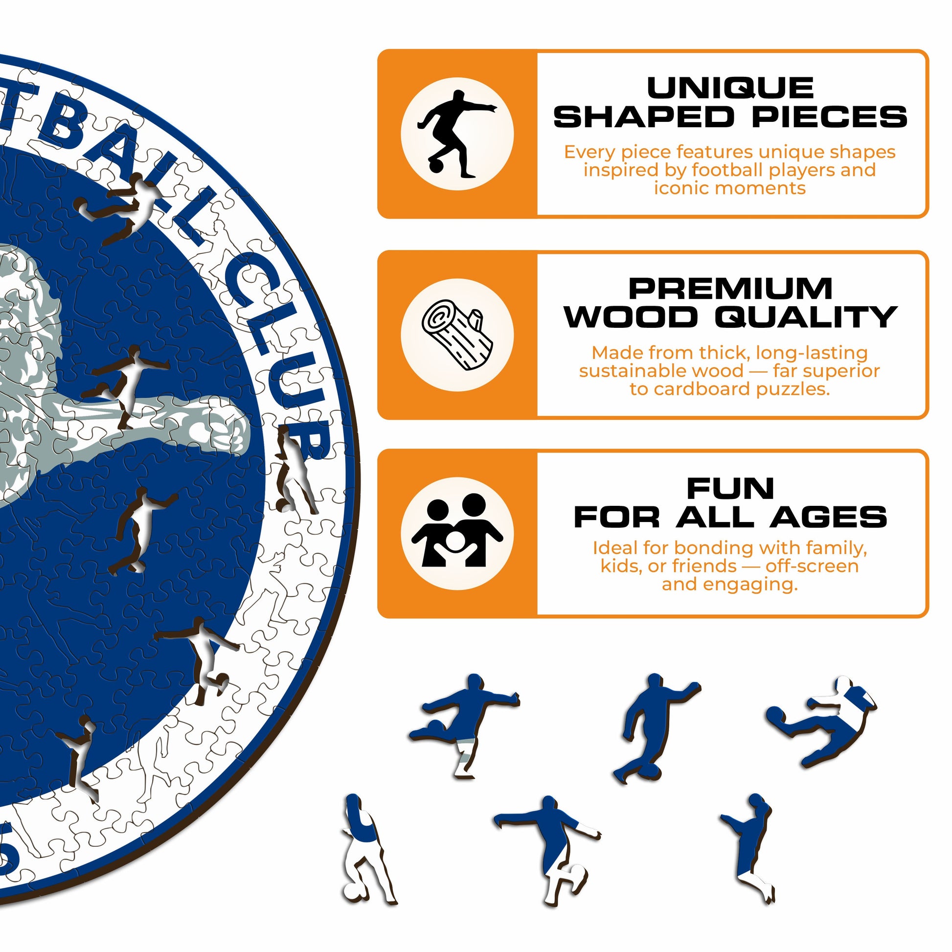 ✓ Each puzzle piece has a unique shape that depicts elements related to soccer and iconic player poses.