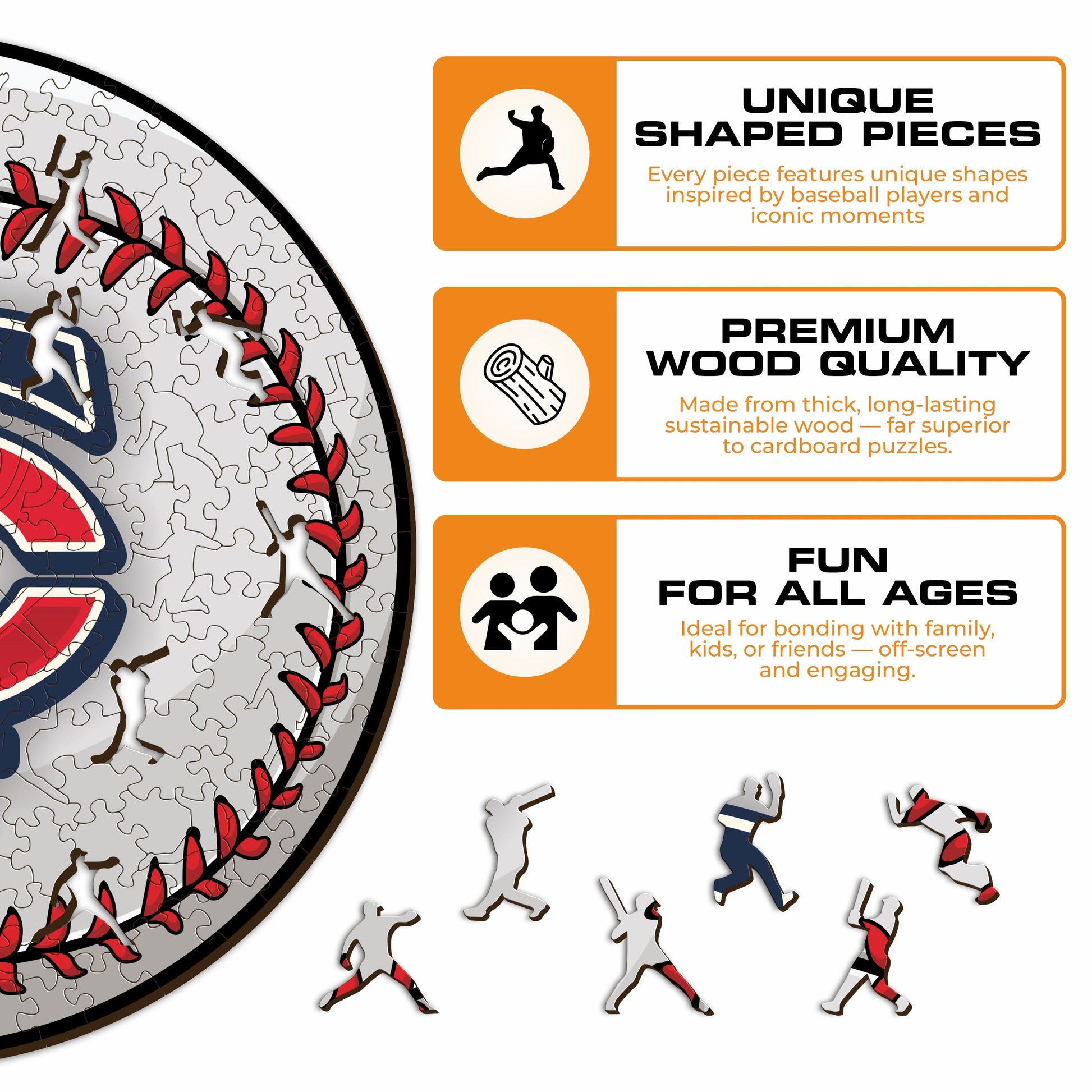 Each puzzle piece has a unique shape that depicts elements related to baseball and iconic player poses.