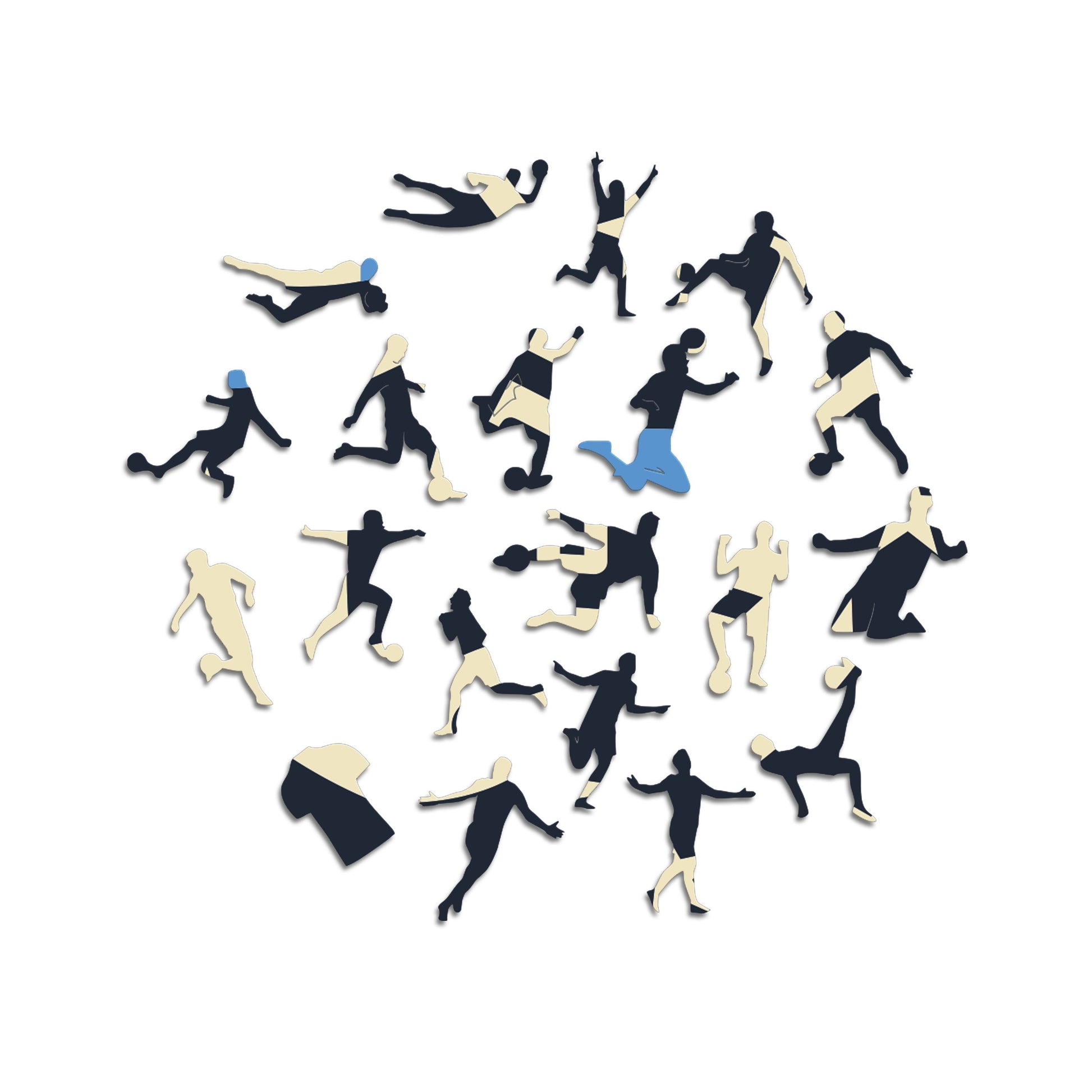✓ Each puzzle piece has a unique shape that depicts elements related to soccer and iconic players poses.