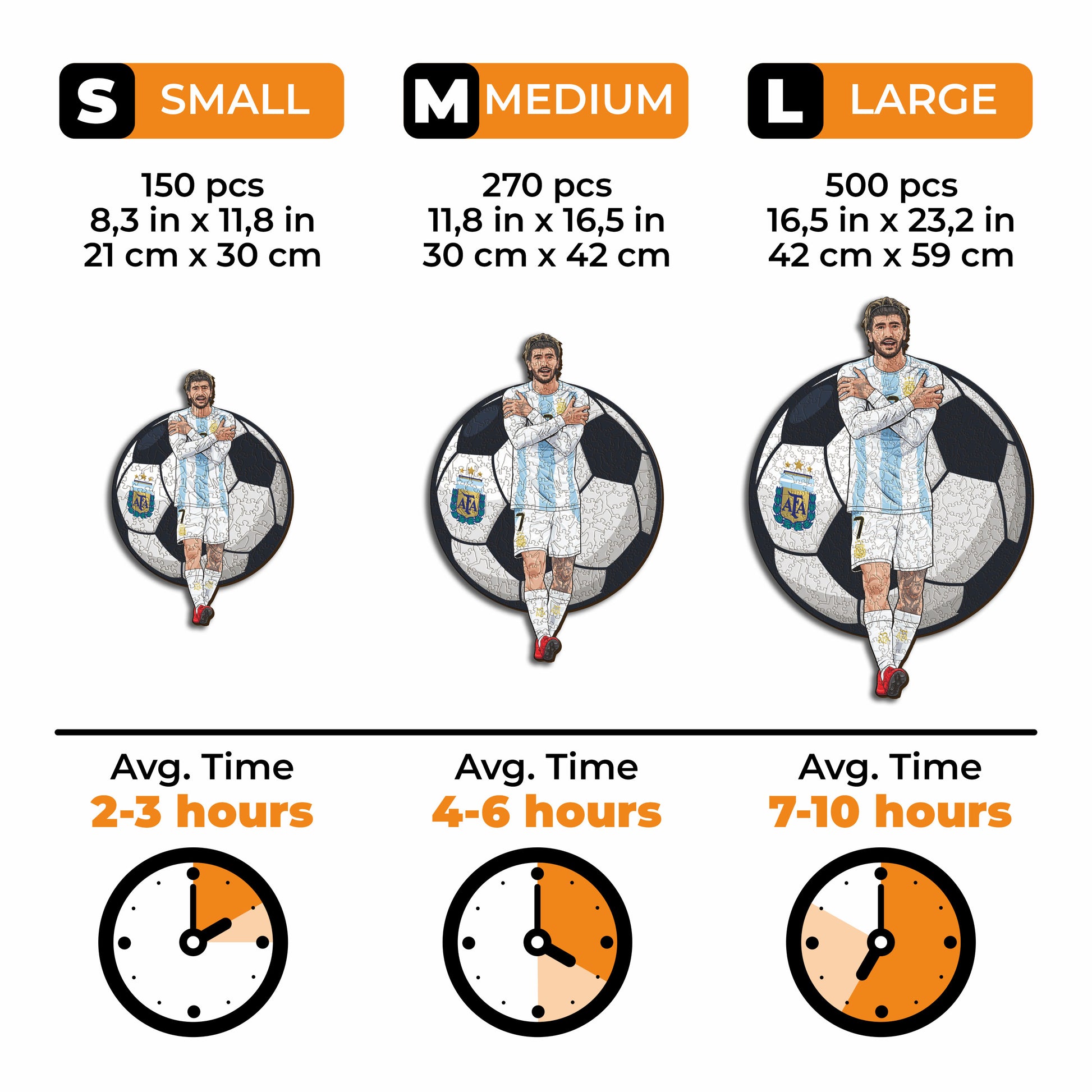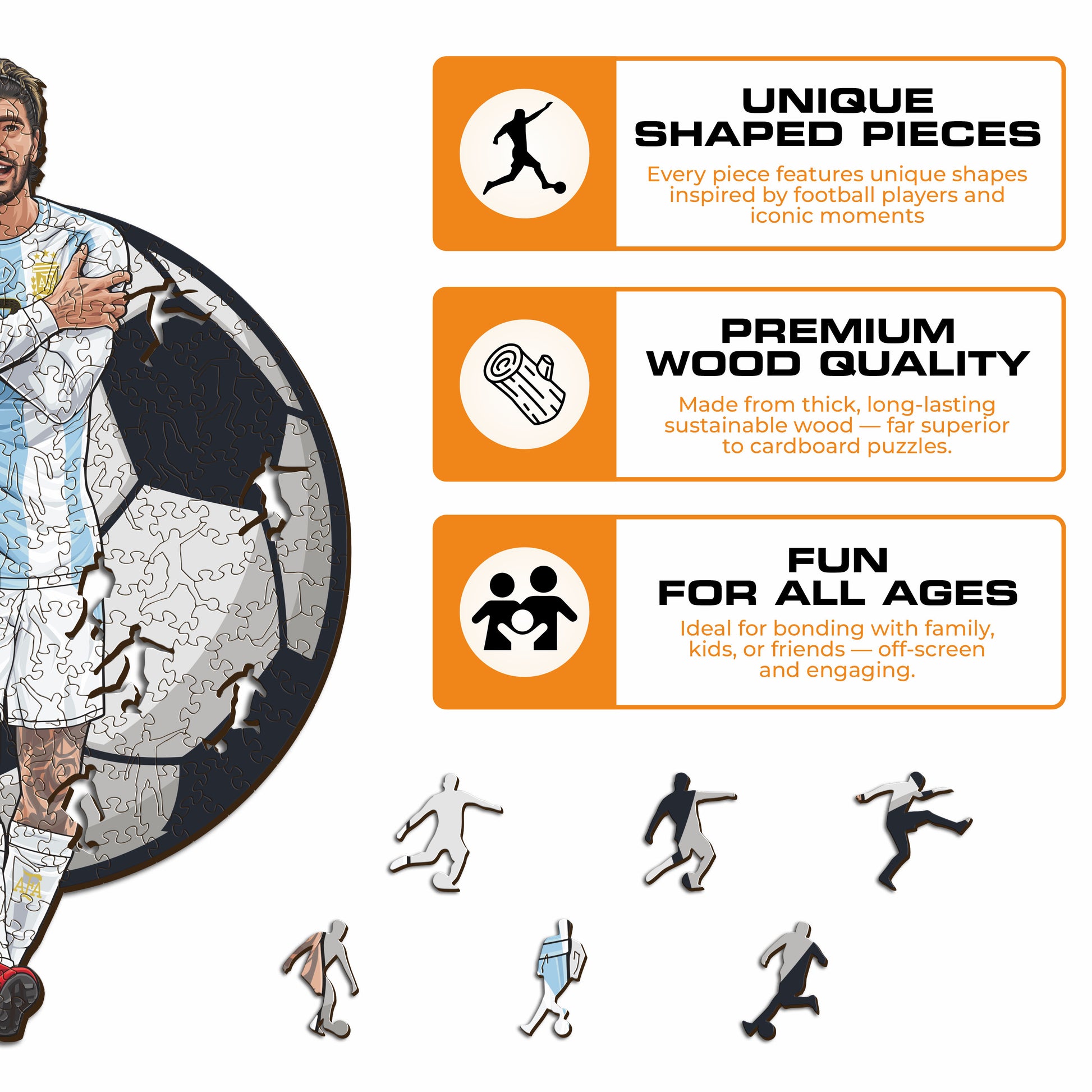 ✓ Each puzzle piece has a unique shape that depicts elements related to soccer and iconic players poses.