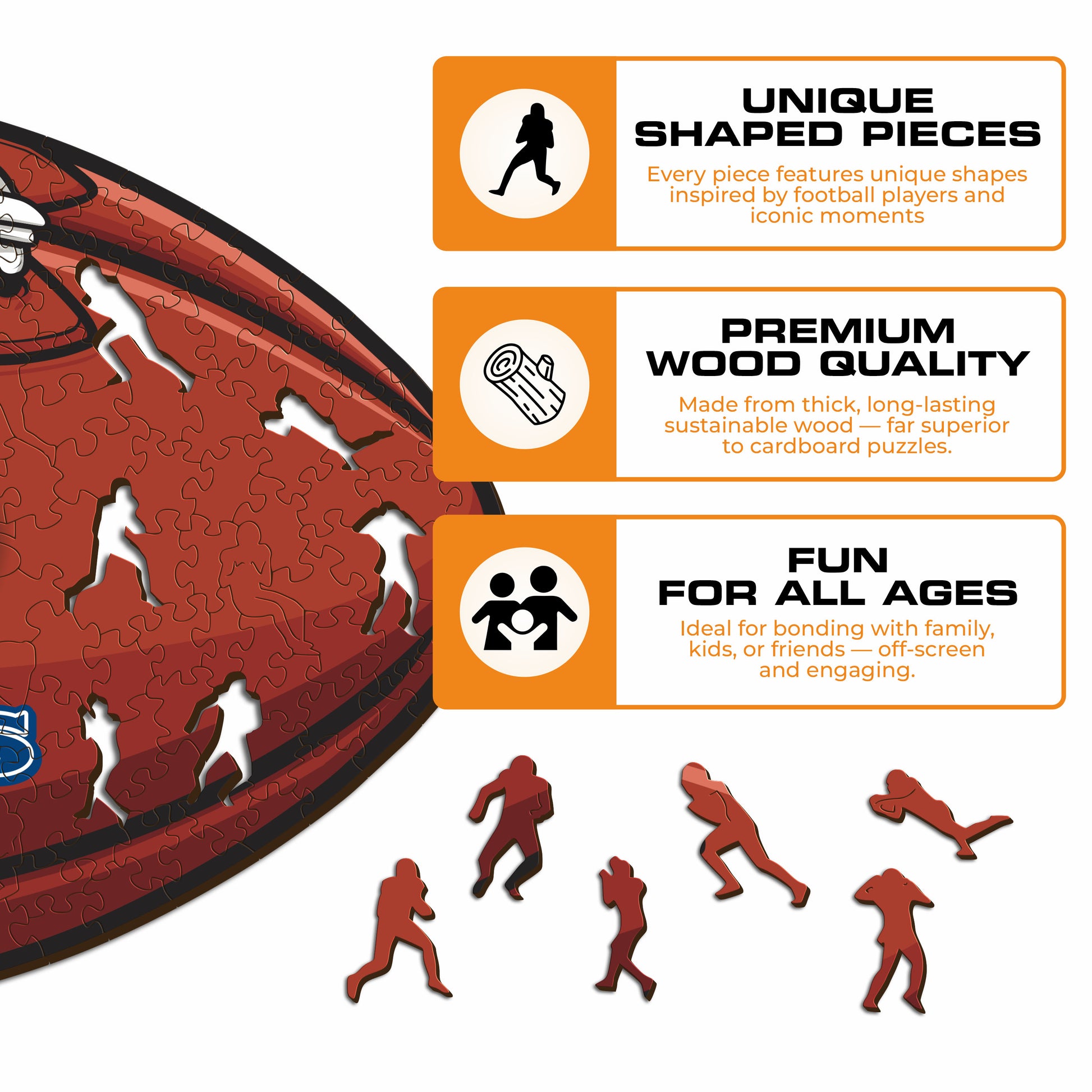 ✓ Each puzzle piece has a unique shape that depicts elements related to football and iconic players poses.