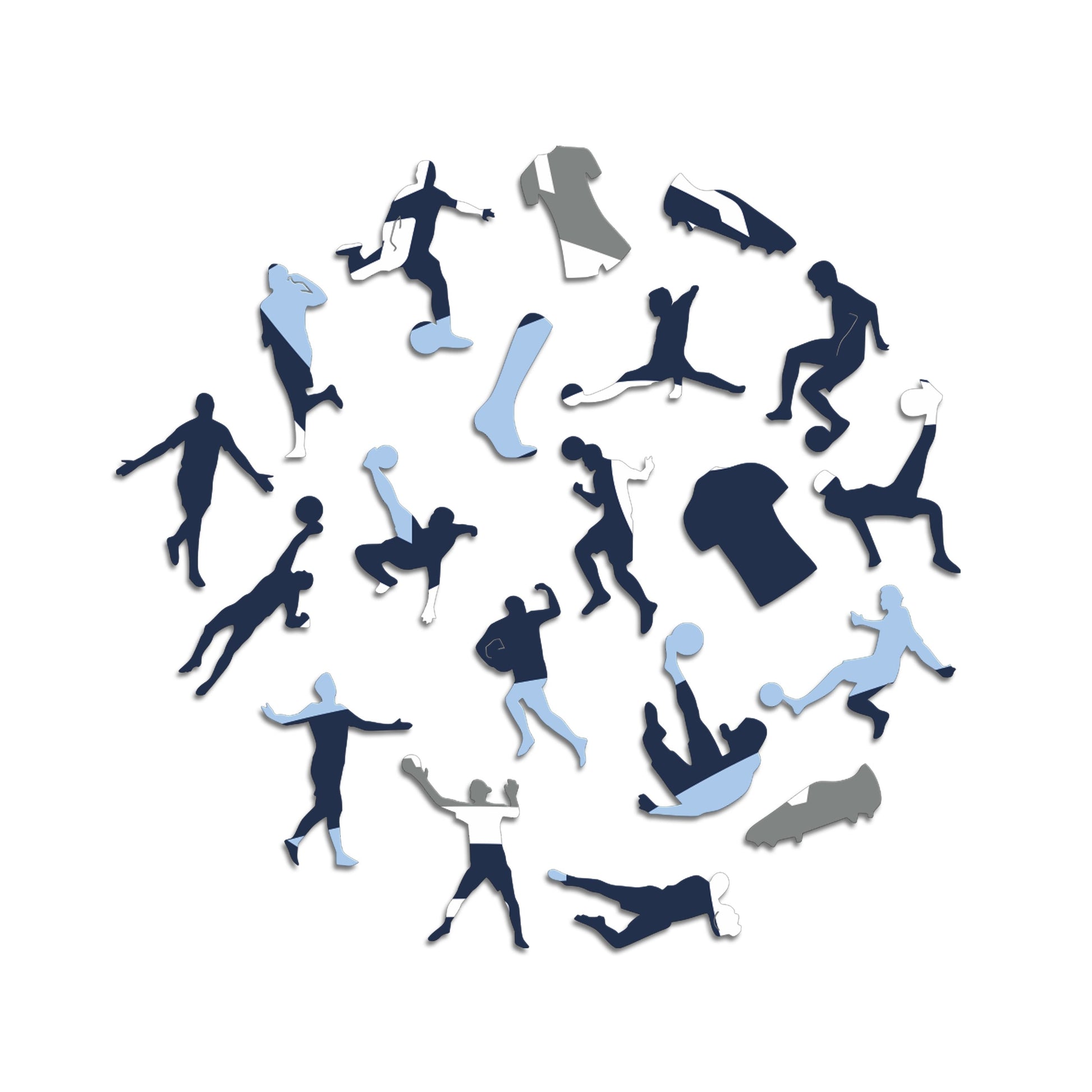 ✓ Each puzzle piece has a unique shape that depicts elements related to soccer and iconic players poses.
