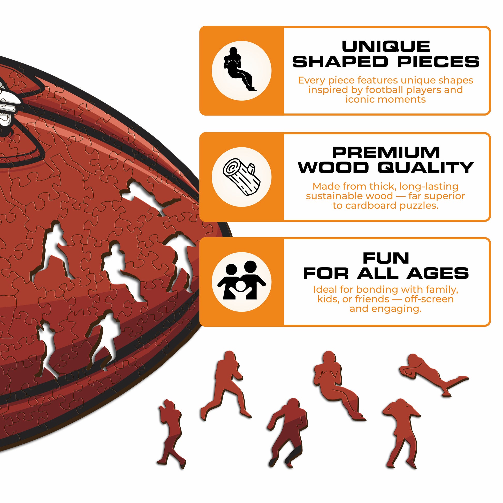 ✓ Each puzzle piece has a unique shape that depicts elements related to football and iconic players poses.