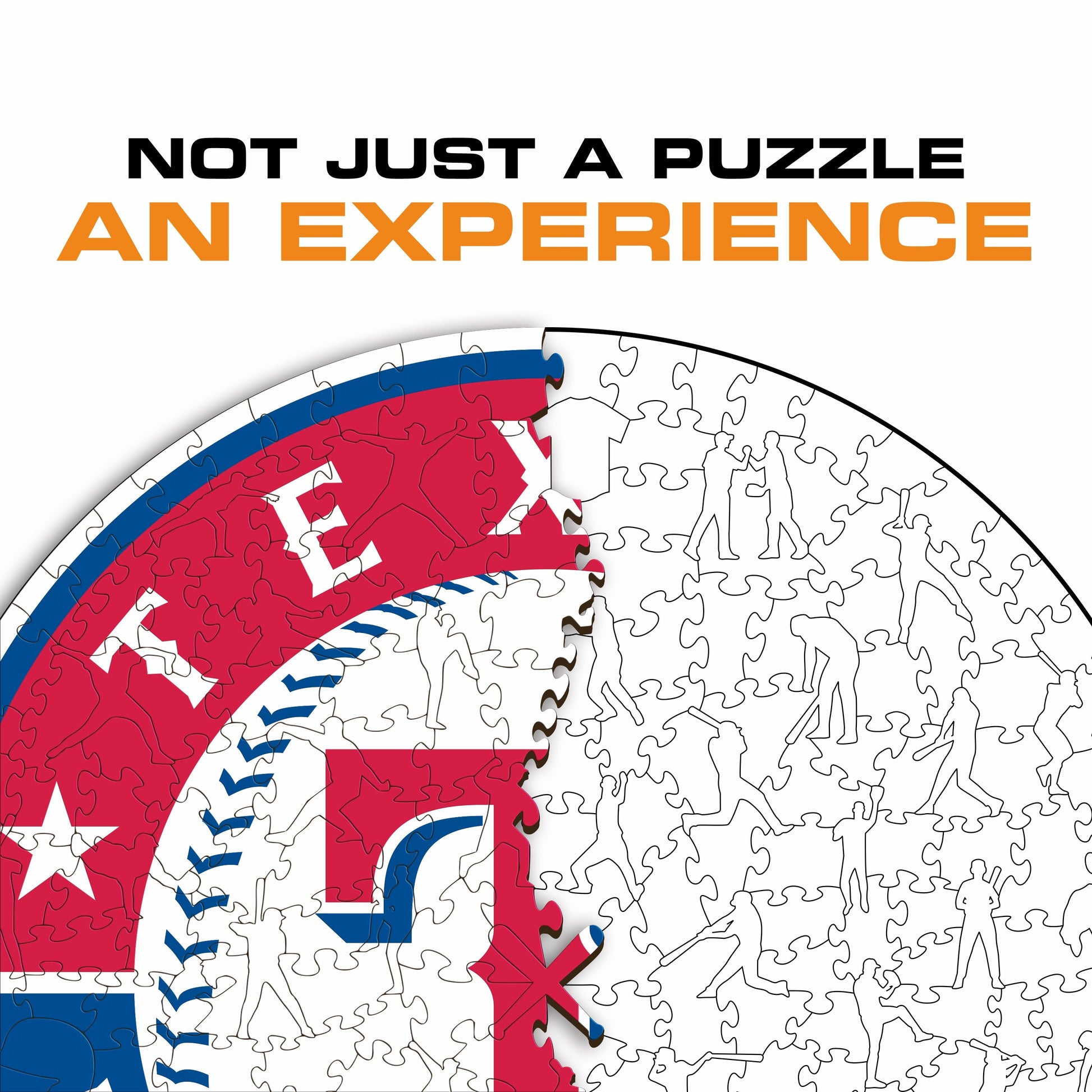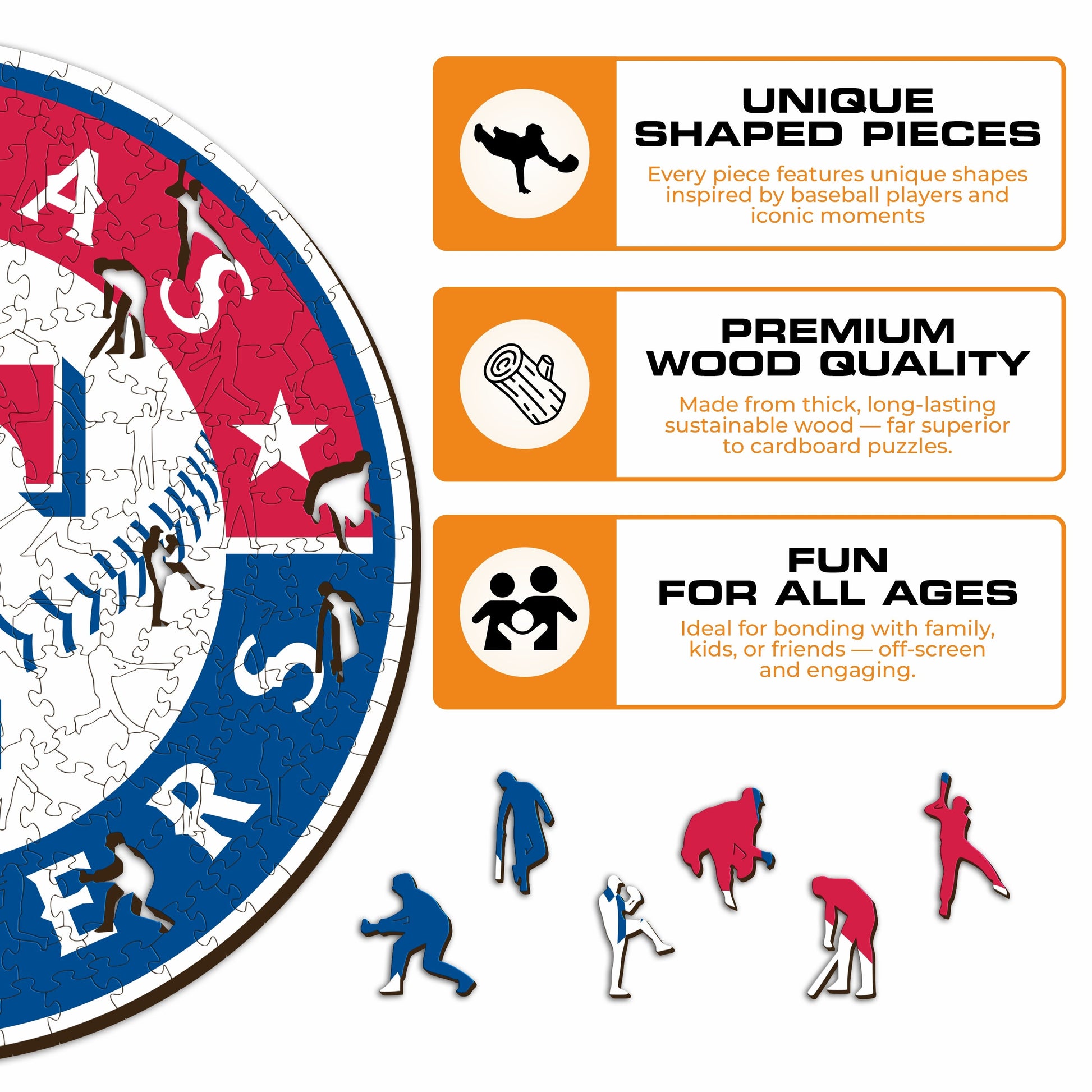 Each puzzle piece has a unique shape that depicts elements related to baseball and iconic player poses.