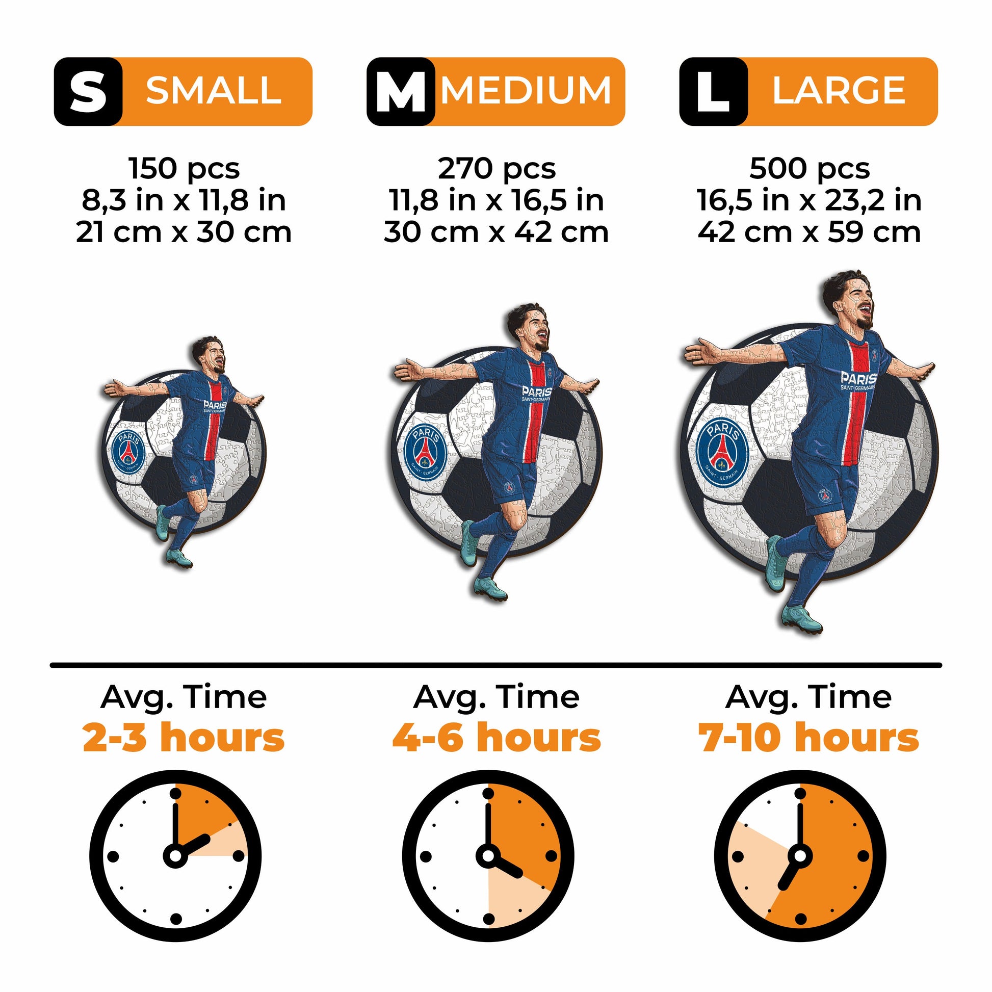 ✓ Each puzzle piece has a unique shape that depicts elements related to soccer and iconic player poses.